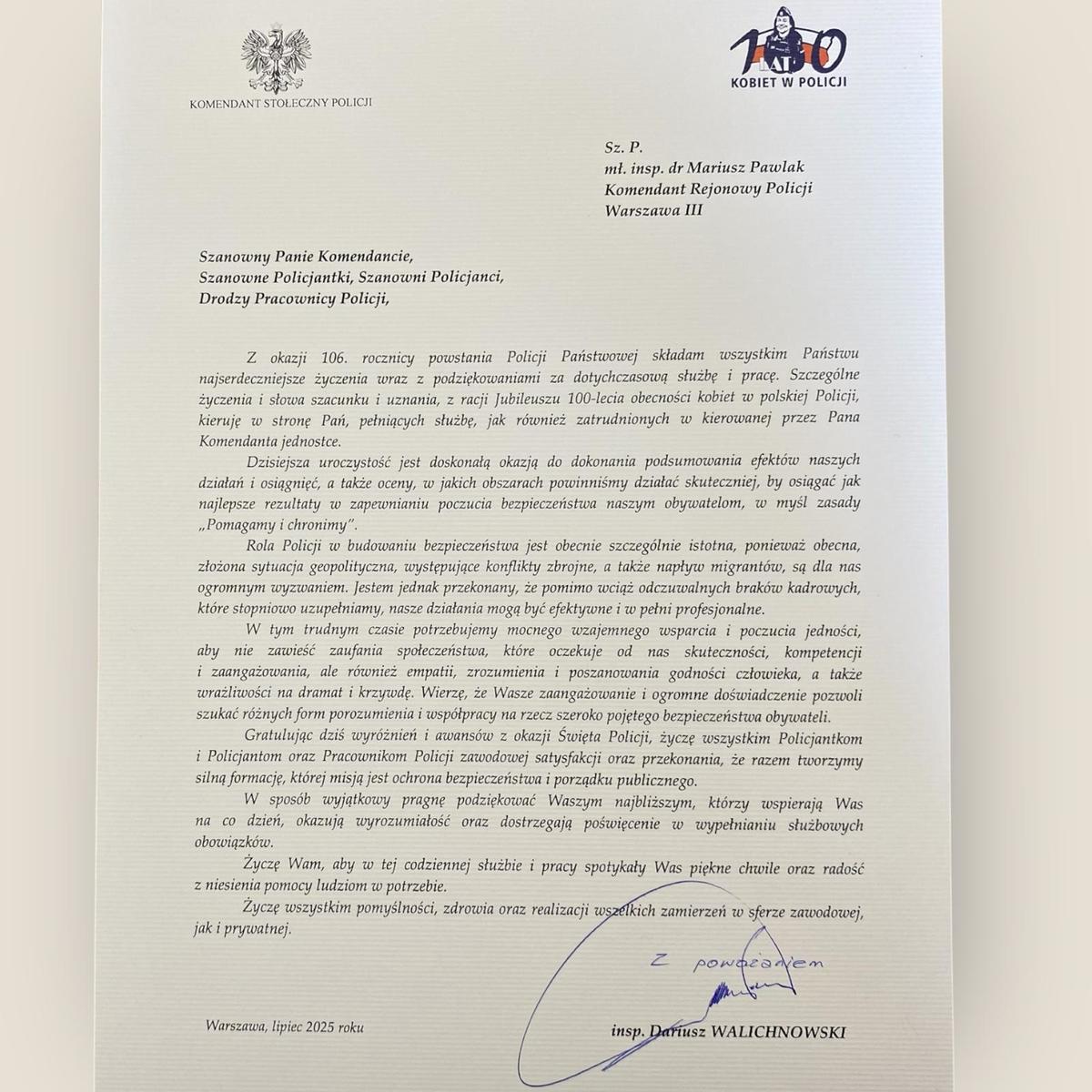 Na zakończenie głos zabrał Zastępca Komendanta Stołecznego Policji insp. Robert Frąckowiak. Zastępca Komendanta Stołecznego Policji odczytał i przekazał na ręce Komendanta Rejonowego Policji Warszawa III list gratulacyjny od Komendanta Stołecznego Policji insp. Dariusza Walichnowskiego. Zastępca Komendanta Stołecznego Policji insp. Robert Frąckowiak zwrócił się do Policjantek i Policjantów. „Składam Państwu najserdeczniejsze życzenia oraz podziękowania za dotychczasową służbę.” Szczególne życzenia insp. Robert Frąckowiak skierował w stronę Pań z racji 100-lecia obecności kobiet w Policji. „Pierwsze kobiety w polskiej Policji Państwowej zostały zatrudnione 26 lutego 1925 roku. Na czele pierwszej brygady sanitarno-obyczajowej stanęła asp. Stanisława Paleolog. Dziś jest Was znacznie więcej. Wasze ogromne zaangażowanie oraz umiejętności są bardzo ważne dla sprawnego funkcjonowania naszej formacji”