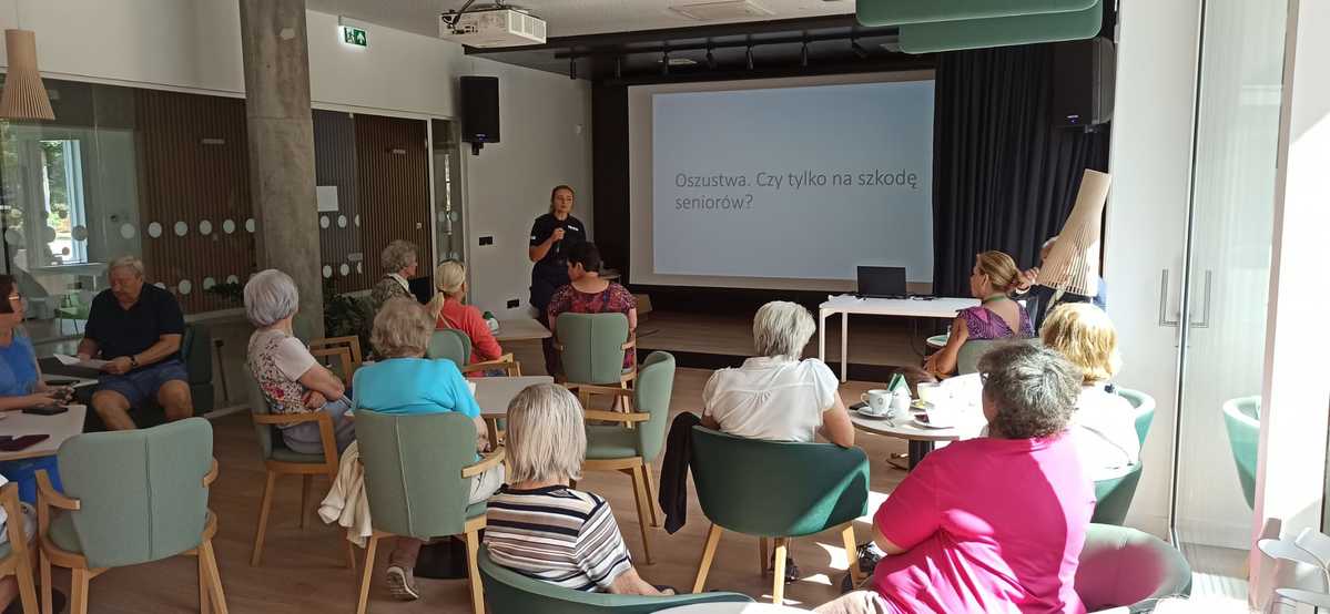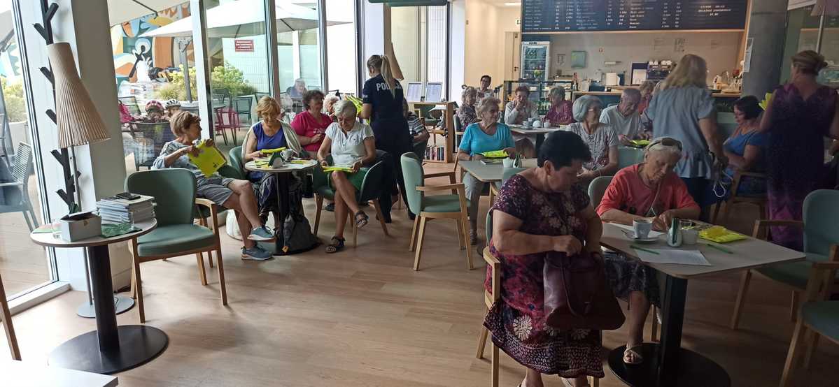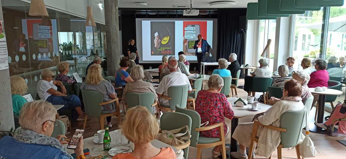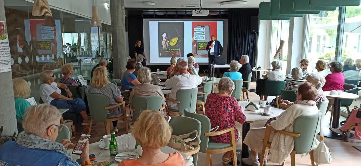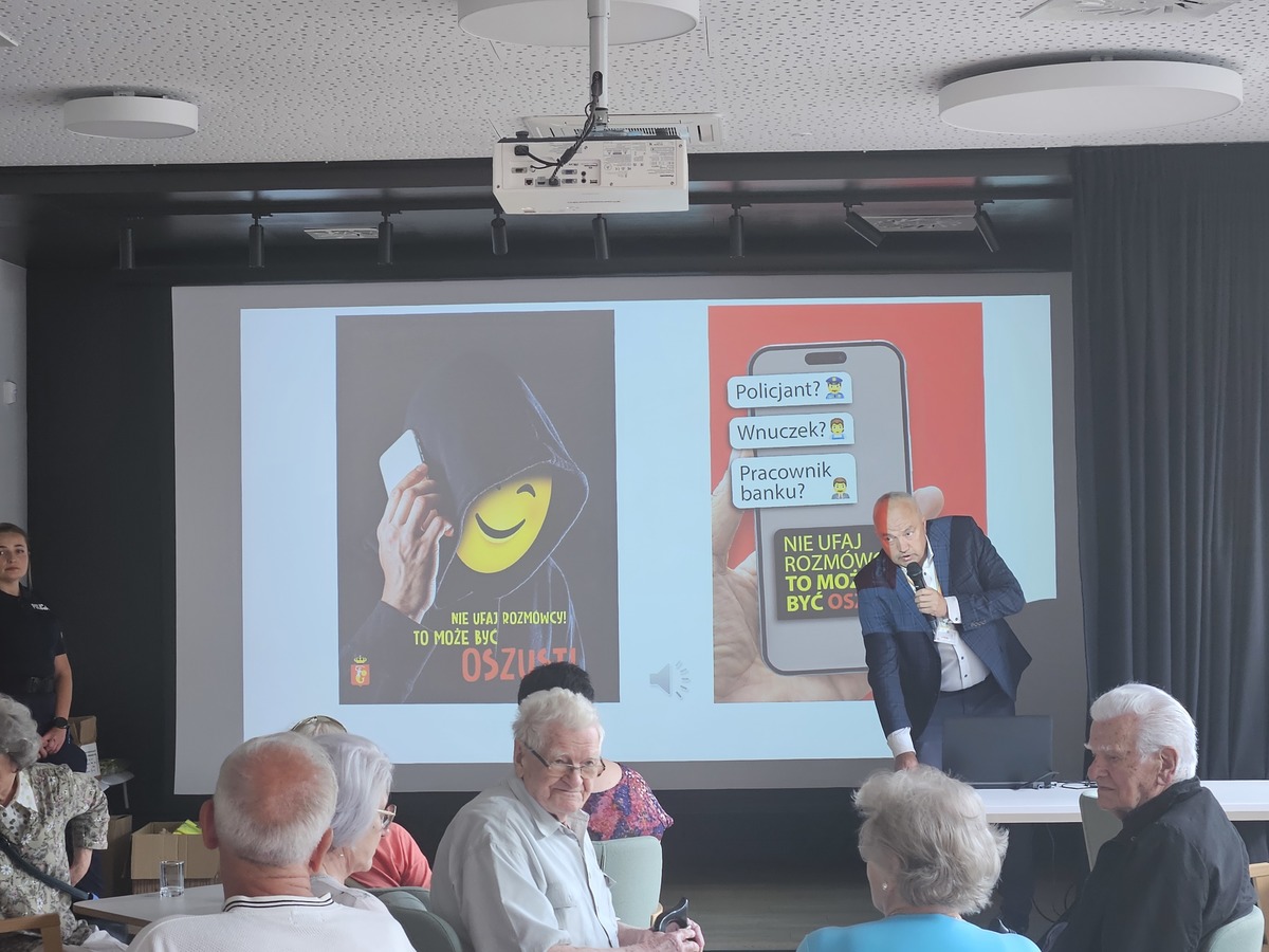 W trakcie spotkania przedstawiliśmy w prezentacji multimedialnej przykłady oszustw i omówiliśmy aplikacje tj. Krajowa Mapa Zagrożeń Bezpieczeństwa i Moja Komenda. Kierownik delegatury SCB w dzielnicy Ochota omówił poradnik „Seniorze, babciu, dziadku nie daj się oszukać!” w którym znajduje się dużo przydatnych i ważnych informacji.