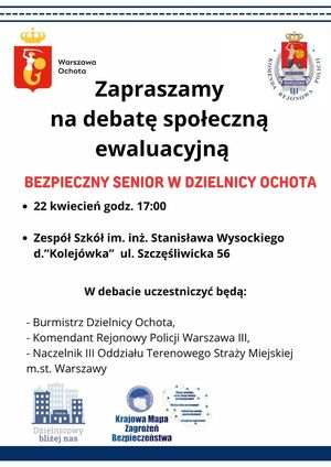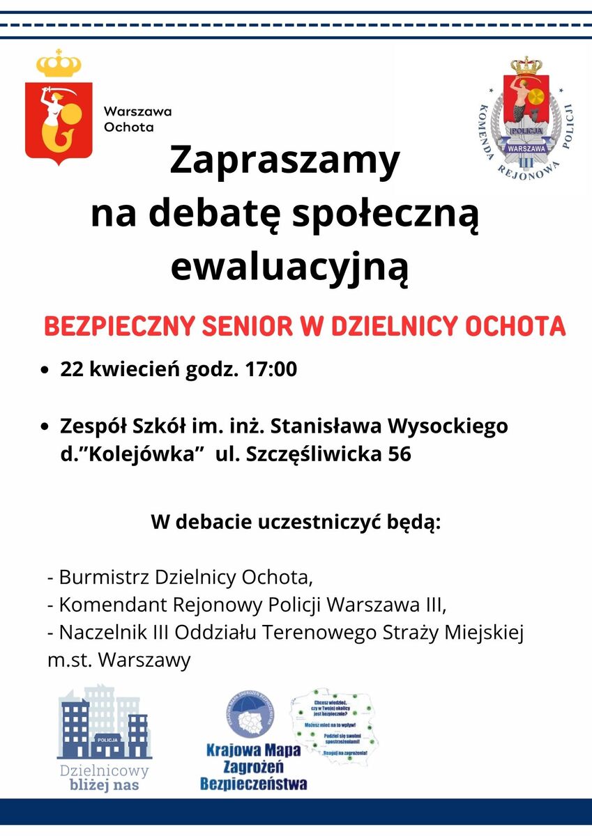 22 kwietnia 2026 r. o godz. 17:00 w Zespole Szkół im. inż. Stanisława Wysockiego d.”Kolejówka” przy ul. Szczęśliwickiej 56 odbędzie się debata społeczna ewaluacyjna. Podczas debaty omówione zostaną postulaty i wnioski zgłoszone podczas spotkania w ubiegłym roku. Zapraszamy do udziału w debacie.