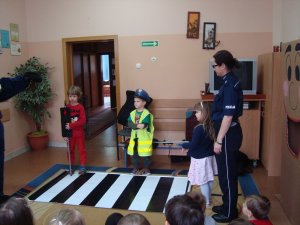 Podczas spotkania mundurowi przypomnieli najmłodszym o numerach alarmowych, z których należy korzystać w sytuacji zagrożenia. Dzieci dowiedziały sie jak trzeba postępować w kontakcie z osobami obcymi oraz jak uchronić się przed atakiem agresywnego psa. Przedszkolaki samodzielnie ćwiczyły bezpieczną pozycję ,,żółwia” oraz właściwe przechodzenie przez  jezdnię.