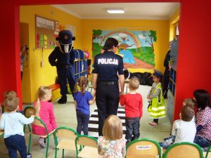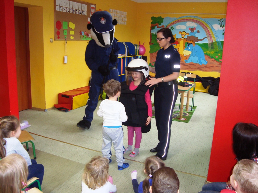Jednak największą atrakcją był pokaz policyjnego wyposażenia do służby. Maluchy mogły przymierzyć umundurowanie policyjne, co było powodem uśmiechu na twarzy każdego przedszkolaka.Na zakończenie wszyscy uczestnicy wykonali pamiątkowe zdjęcie.