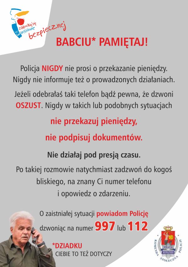 Komenda Stołeczna Policji uruchomiła specjalną linię telefoniczną dla tych osób, które podejrzewają, że mógł do nich zatelefonować oszust podający się za „wnuczka”, „krewnego” lub „policjanta – funkcjonariusza CBŚP”.